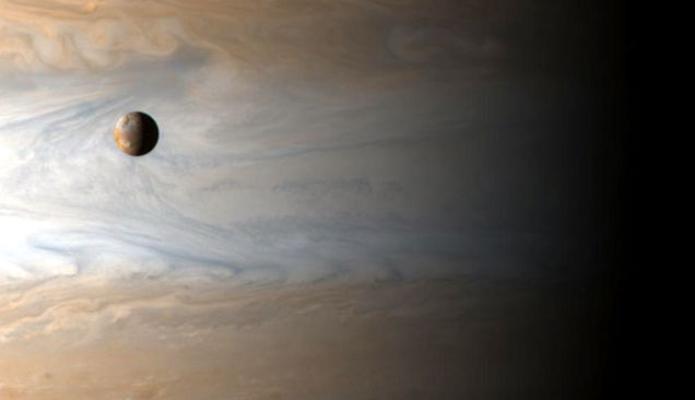 This is a picture of Jupiter's moon Io floating over the planet's clouds, to remind you how freaking huge Jupiter is. Io is the same size as our own moon. To celebrate the battle of Jupiter's Red Spots, in which the original Daddy Red seems to be in the process of eating the other two, the Boston Globe posted a set of the greatest Jupiter photos of all time, from NASA. Click through for a few of our favorites, including some truly spooky views of Europa and Io.