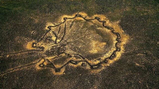 These are the remains of a "desert kite", a giant animal corral built out of stones some 5,500 years ago. They were effectively the world's first slaughterhouses, as dozens of animals at a time were herded inside and killed.