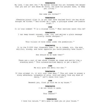 We adhered to strict guidelines regarding the usage of Shakespeare's works. Each line and phrase is taken directly from folios printed by or before 1685, and many extended sections of dialogue are composed of individual lines from separate works. Only proper nouns and pronouns were subject to change, as dictated by the plot. In these instances, all proper nouns are supplanted only by pronouns or other proper nouns, and all pronouns by other pronouns. In some cases, corresponding verb tenses are modified. These practices enabled us to accurately retell the story of Terminator 2: Judgment Day while remaining true to the words of Shakespeare in form (if less so in intent) . . . You'd be amazed by how perfectly the themes so pervasive in Shakespeare's plays lend themselves to the story of the Terminator: horrific prophecies, charges of madness, the terror of an implacable enemy, the fierceness of a mother's love for her son . . . We've broken down our budget item for item, and $3,000 is on the low end of our potential operating range. And that's rehearsing in a warehouse that doubles as a moped co-op. Our hope is to raise enough to build a production that's not only memorable, but portable. If the audience is there, we'd love to expand our reach to meet them.