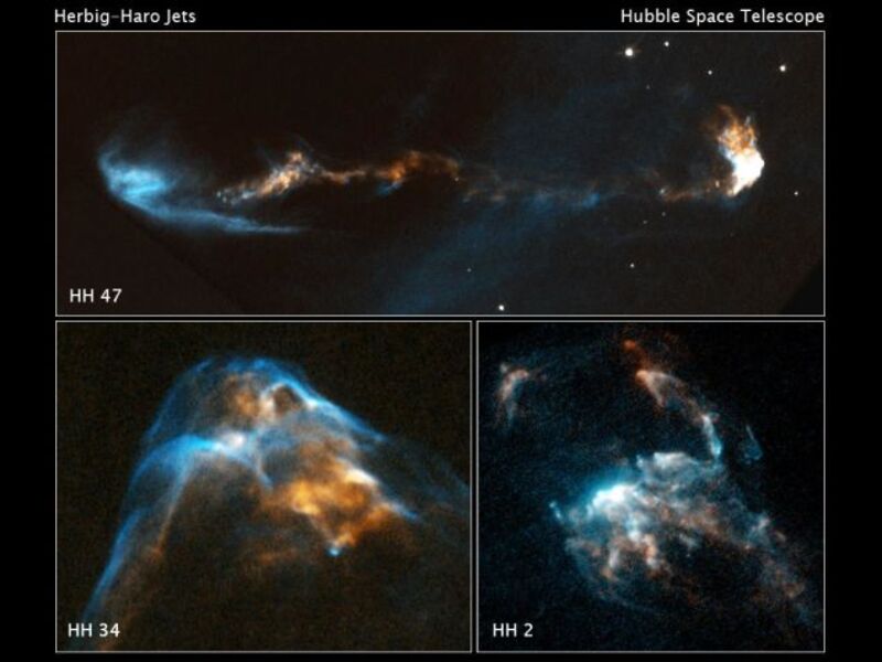 The movies, compiled in the video up top, depict jets HH 1, HH 2, HH 34, HH 46, and HH 47. HH 1 and HH 2 are actually a pair of jets being ejected in opposite directions by a single star, as are HH 46 and HH47. Pictures of the jets were taken at various points in time between 1994 and 2008.