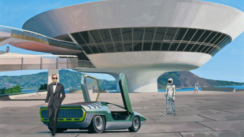 WAITING DANGEROUSLY IN RIO (WITH AN ASTRONAUT) | If there's a weird building, a race car, and an astronaut, it must be some kind of conspiracy flick. Painting by Scott Listfield.