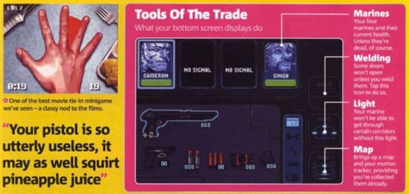 Alien Infestation has raised the bar for cool easter eggs. Apparently there's a mini-game hidden inside the handheld game, where the player can recreate Bishop's fancy knife trick with the stylus. But does Bill Paxton scream when you miss?
