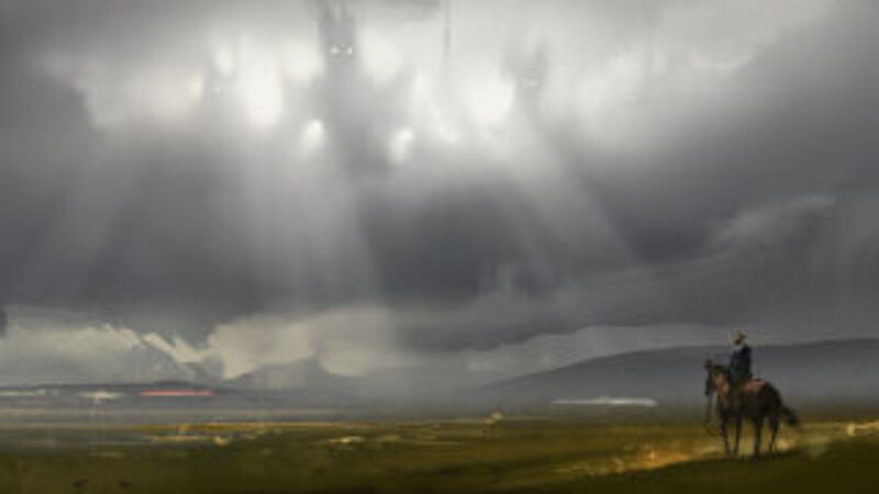 The Sky Kings peer down at the horseman who has come ... to seek their advice? Their blessing? To bring them news that rather irritates them? Or is this a chance enounter, a stunning moment of happenstance for this lonely cowboy? Or perhaps he is a fellow Sky King, wearing an earthly disguise?