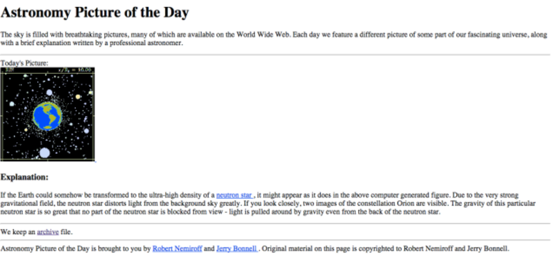 I can remember visiting Astronomy Picture of the Day from the Macintoshes in my elementary school computer lab (this was in the mid-nineties, before Apple started calling its computers “Macs”). Today, some two decades later, I still visit APOD regularly. How many websites can you say that about?