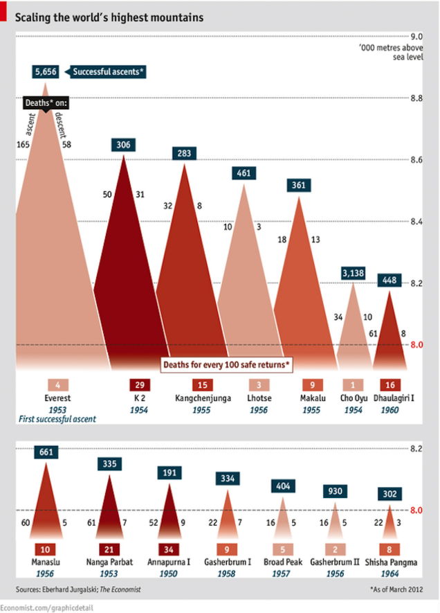 Everest's smaller and less well-trodden Himalayan sisters tend to be much deadlier. For every three thrill-seekers that make it safely up and down Annapurna I, one dies trying, according to data from Eberhard Jurgalski of 8000ers.com, collected in his forthcoming book "On Top of the World: The New Millennium", co-authored by Richard Sale. This goes some way to explaining why it is the least popular of the 14 mountains over 8,000 metres, having seen just 182 safe returns.