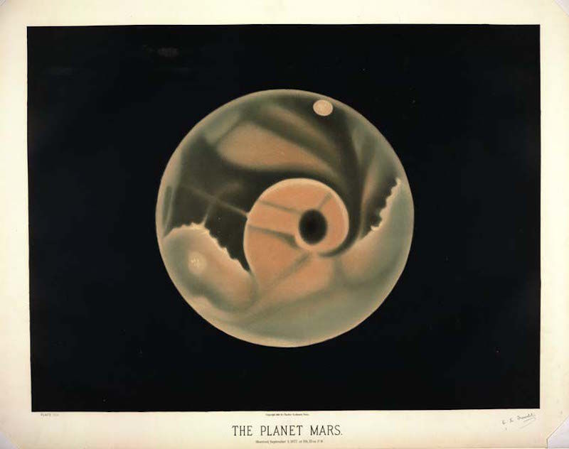 The New York Public Library is a treasure trove of public domain images. Among them are the Trouvelot Astronomical Drawings, which have images of space as observed throughout the late 1800s. Above is Mars from 1877, which looks less like we see in NASA images and more like an artist’s impression an octopus stuck in a fishbowl.