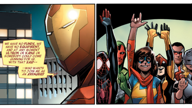 The thing is though, in the comics themselves, the Avengers haven’t existed in an official capacity until this week’s release of All-New, All-Different Avengers #3. After spending the last two issues haphazardly bumping into each other, Captain America, Iron Man, The Vision, Thor, Nova, Ultimate Spider-Man, and Ms. Marvel came together to take out a Chitauri warlord called Warbringer. The threat over, it comes to Stark to make the decision to reassemble Earth’s mightiest heroes—but even he stresses that it isn’t guaranteed the team will stick it out.