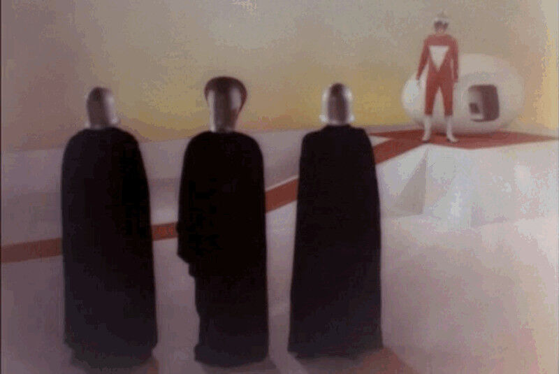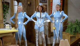 Then she said she had a problem with her entrance. Robin comes running into the apartment, says to Pam [that] the Nekrons, or whoever they were, are coming to kidnap him. And she says, “When are they coming?” He says, “They could be here any second!” And there’s an explosion. The doors to the apartment fly off, onto the couch. And in walks the first girl. Vicki Fredericks walks down stage left. The other girl comes down, walks down stage right, and they both pose with their hands on their hips. And then Raquel enters.
