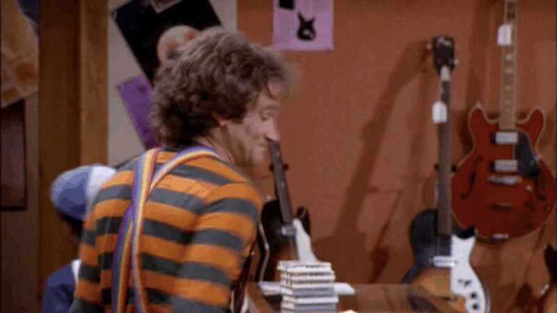 [After the run-through], we went upstairs and [rewrote the pilot script.] We wrote a lot of stuff that became the basis for a lot of the “runners,” or repeated jokes [on Mork and Mindy]. We used a lot of what [Robin Williams had] created on the spot. You would say “Take a chair,” and he would sit with his head on it instead of his ass. Like, [Happy Days producer] Bob Brunner came up with [Mork] drinking with his finger. Everyone was firing on all cylinders that night, believe me.