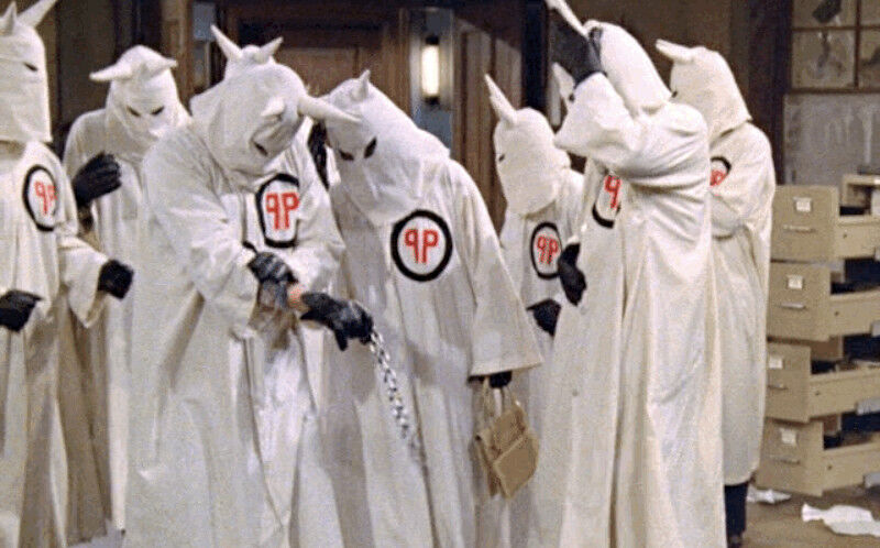 [Then this group] has a big KKK meeting, and they’re all wearing hoods. And [Mork] zaps them with his special powers, and turns them all into blacks and [Native Americans] and Hispanics.