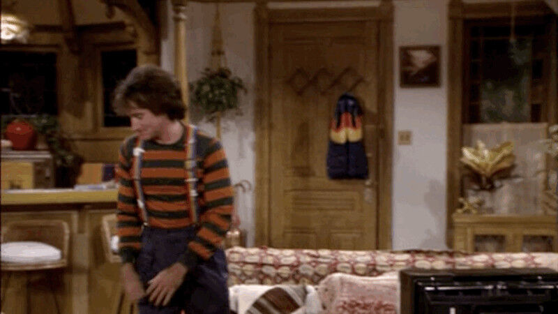 The first time I wrote, “Mork says ‘heavy sigh’”—which normally you would see that as a stage direction, on a three-camera script: “parentheses, bold caps, “heavy sigh”, close parentheses.” It’s a note to the actor that you’re supposed to go [makes a sighing noise] before that line. But I wrote it as Mork saying [aloud],“looking sad, heavy sigh,” and then keep talking. And it worked! It got a laugh. So that became something he would do. He would say things that you would normally think of as stage directions.